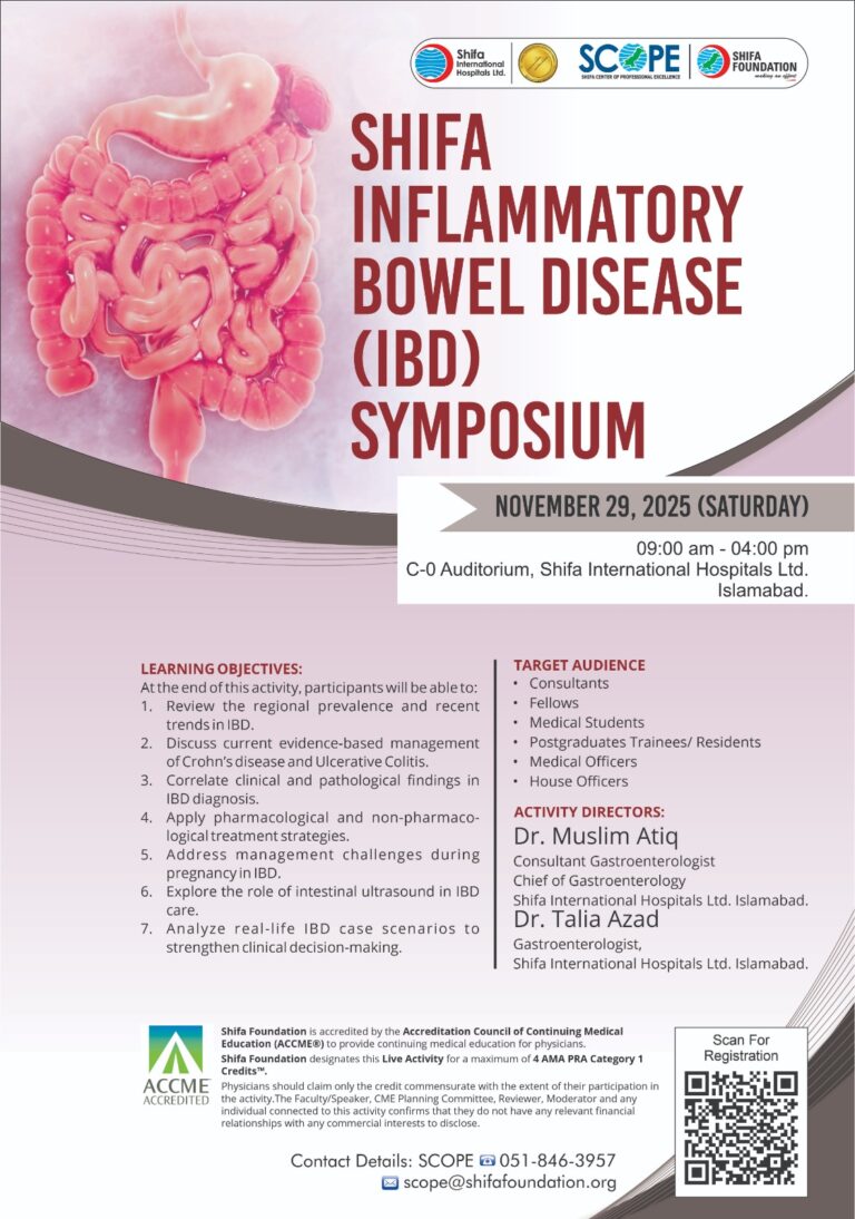 Shifa Inflammatory Bowel Disease (IBD) Symposium 2025 Saturday, 29th November 2025 • 09:00 AM – 04:00 PM Location: C-0 Auditorium,...